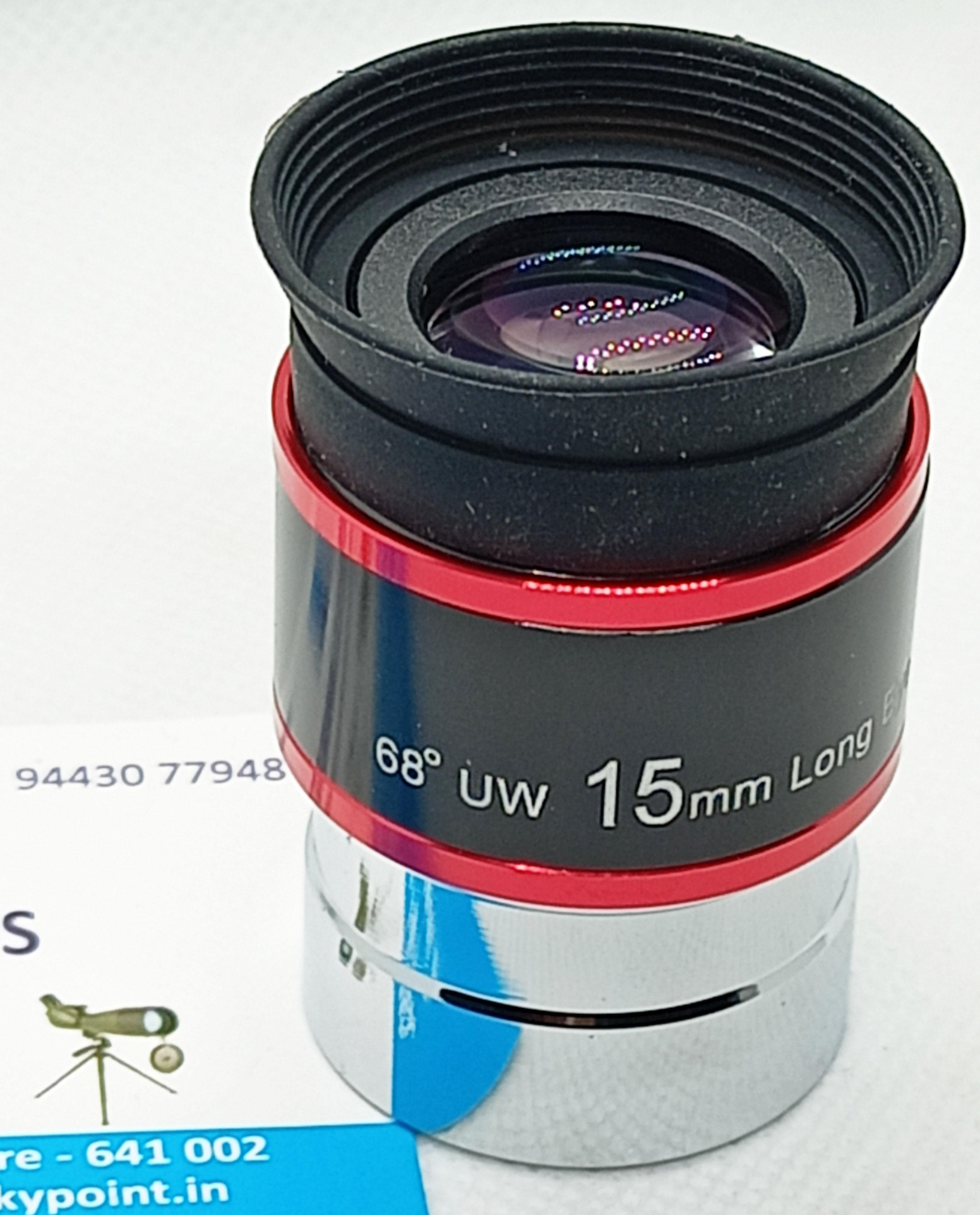 1. 15mm Ultra wide angle 1.25" telescope eyepiece,13mm eye relief provide comfort and convenience 2. Ultra wide 68Degree apparent field of view gives you that unforgettable lost in space feeling 3. 5-Elements / 4-groups made of high index glass deliver sharp, high contrast vistas 4. Twist-Up eyecups, and barrels threaded for use with 1.25" eyepiece filters (M28.5*0.6) 5. Sleek black barrel with safety undercut to reduce the possibility of the eyepiece slipping out of the focuser or diagonal 6. Blackened lens edges, anti-reflection threads for maximum contrast