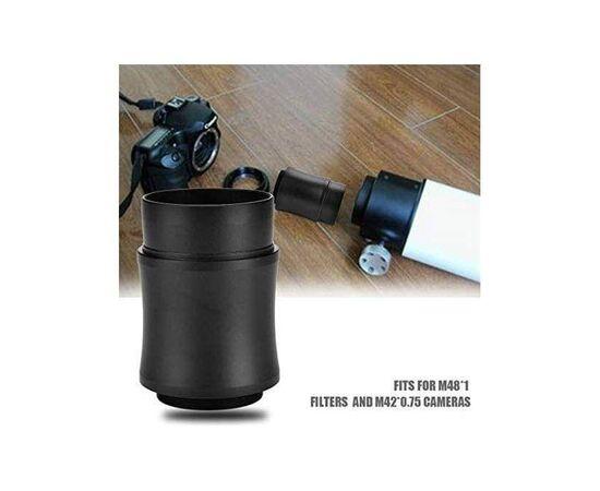 2" telescope camera mount adapter extension tube M42x0.75mm, sutitable for Nikon Canon Sony DSLR camera universal. 2" Diameter T Adapter:suitable for standard 2" telescope and microscope. M42x0.75mm Threads:connect the T-ring mount and T-Mount,fits for M48*1 filters and M42*0.75 cameras. Put the telescope eyepiece into extended tude, screw t adapter and t ring adapter, then attach camera to telescope. It has a slope design on the bottom to prevent camera from falling when the mounting screw is loose.
