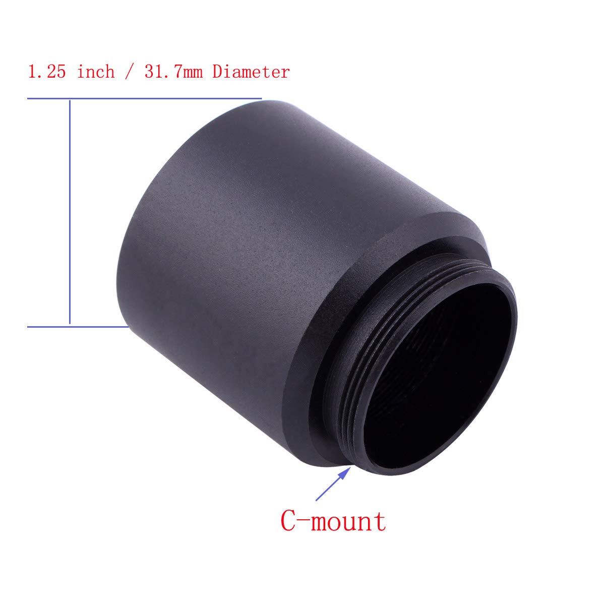 This adapter make you attach your video camera with a 'C' or 'CS' thread to your telescope for prime focus photography. C-threads are commonly used in most consumer video cameras whereas the CS thread is mostly used in security cameras. The camera must have a standard removable C-mount lens, which is a 1" diameter thread. Will not work on video cameras with a fixed lenses or bayonet mount. Useway: attach the camera to the C-thread of this adapter. Then slide the 1.25" barrel into your 1.25" telescope focuser and you are ready to shoot. Internally grooved to reduce stray light reflection for maximum contrast Features: Internally grooved to reduce stray light reflection for maximum contrast Made of black anodized aluminum Camera/Camcorder Fitting: C-Mount Lens Fitting: 1.25" telescope lens Type: Lens Adapters Model: 1.25" telescope lens Total Length: 30mm