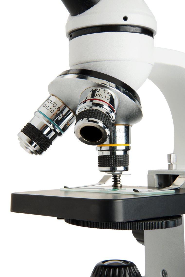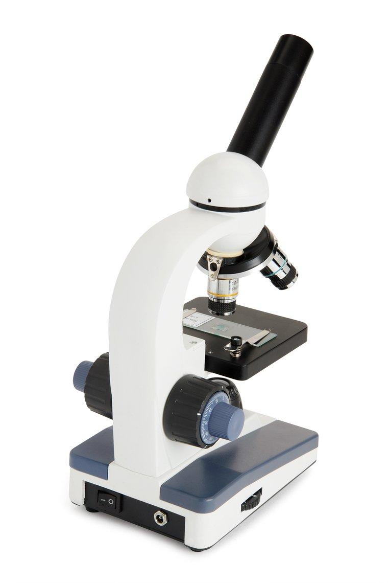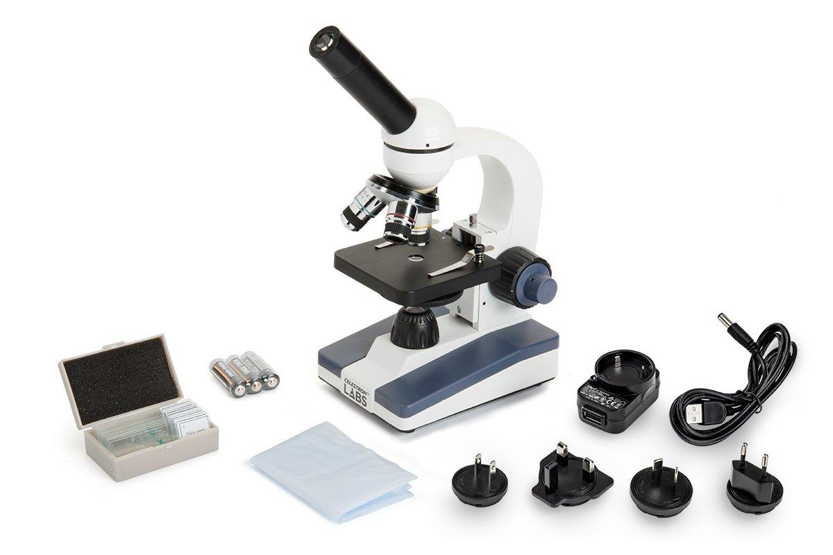The Celestron Labs CM400C compound microscope offers all the essential features you need in a lab-ready microscope at an economical price. The 10x eyepiece and three objective lenses (4x, 10x and 40x) allow for magnifications of 40x, 100x, and 400x. An adjustable lower illuminator provides bright, detailed views with true-to-life colors for translucent specimens. This LED illuminator stays cool to the touch even during long viewing periods. The simple condenser with rotating disc adjusts the lower illumination for enhanced viewing. All these features make the CM400C an excellent tool for labs, schools, field use and more.