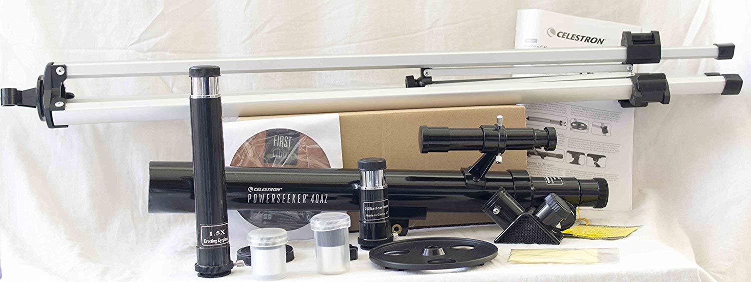 The Celestron powerseeker 40az telescope (Telescope for Astronomical & Land observing, 40 mm Aperture, 94x magnification REVEAL THE DEPTHS OF OUR SOLAR SYSTEM AND THE WONDERS OF NATURE. A telescope is an instrument that aids in the observation of remote objects by collecting electromagnetic radiation (such as visible light). The first known practical telescopes were invented in the netherlands at the beginning of the 17th century, using glass lenses. They found use in terrestrial applications and astronomy. Overview: sharp image optics for land observing. Quick and easy no tool set up, perfect for beginners fully coated glass optics with high transmission coatings for enhanced image brightness, contrast and clarity 2x barlow lens which doubles the magnifying power of each eyepiece. The skyx firstlight astronomy software/ cd. Description: amateur astronomy is a great family hobby that can be enjoyed year round, and Celestron's powerseekers are the ideal choice for families looking for telescope that will provide many hours of enjoyment for children and adults alike. The powerseeker series is designed to give the first-time telescope user the perfect combination of quality, value, features and power. The model feature sharp image optics for astronomical and land viewing. Specifications: aperture (mm) 40 mm (1.57 in) focal length 500 mm (20 in) focal ratio 13 focal length of eyepiece 1 (mm) 8 mm (0.31 in) magnification of eyepiece 1 63 x focal length of eyepiece 2 (mm) 20 mm (0.79 in) magnification of eyepiece 2 25 x barlow lens 2 x finderscope 2x20 mount type altazimuth highest useful magnification 94 x lowest useful magnification 5.71 x limiting stellar magnitude 10.5 resolution (Rayleigh) 3.48 arc seconds resolution (Dawes) 2.9 arc seconds light gathering power (Compared to human eye) 33 x optical coatings fully coated