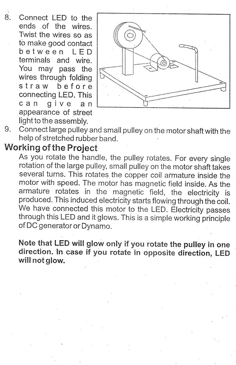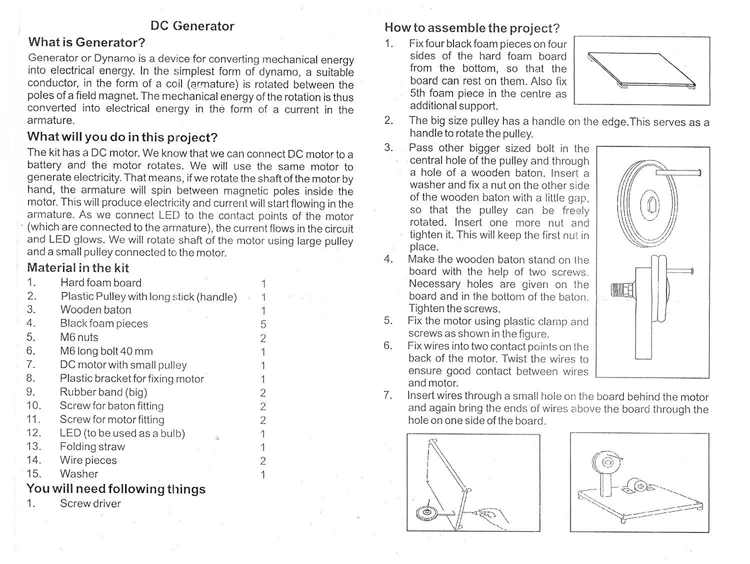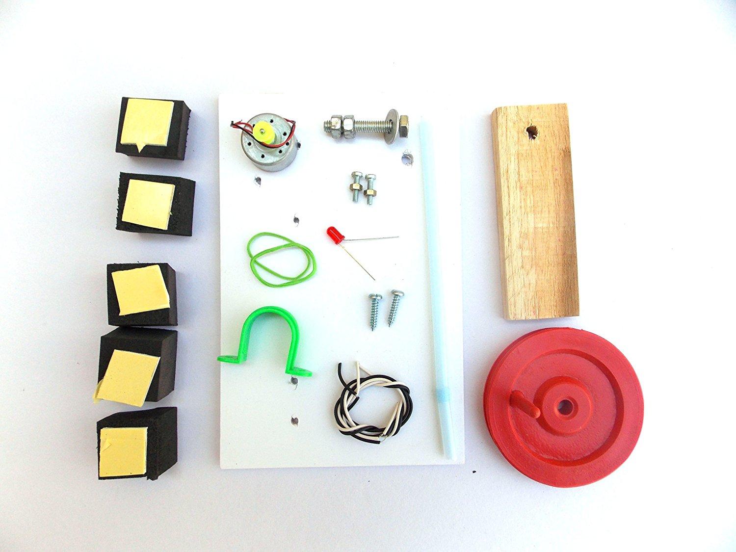 Kit to make working model of electricity generator or dynamo Make a hand operated generator and show glow of LED by generating electricity. It will help kids to learn basics of electricity generation using mechanical energy. Hands-On Physics Educational concept learning. No More Rote Learning.