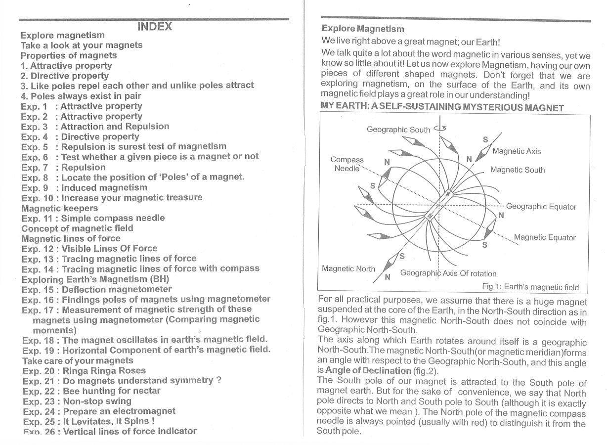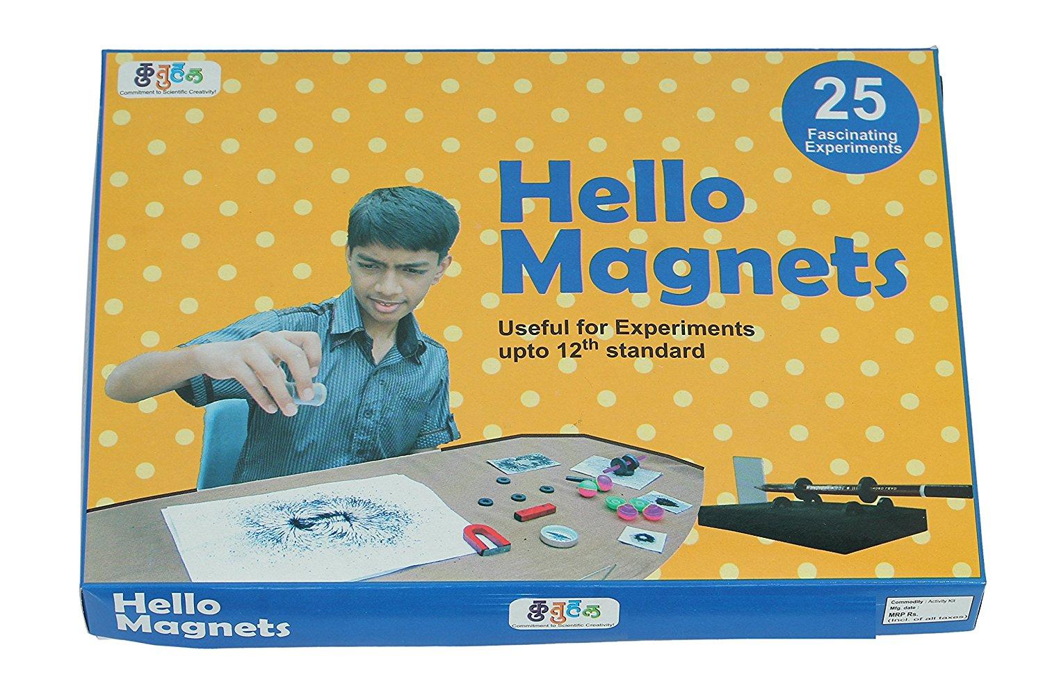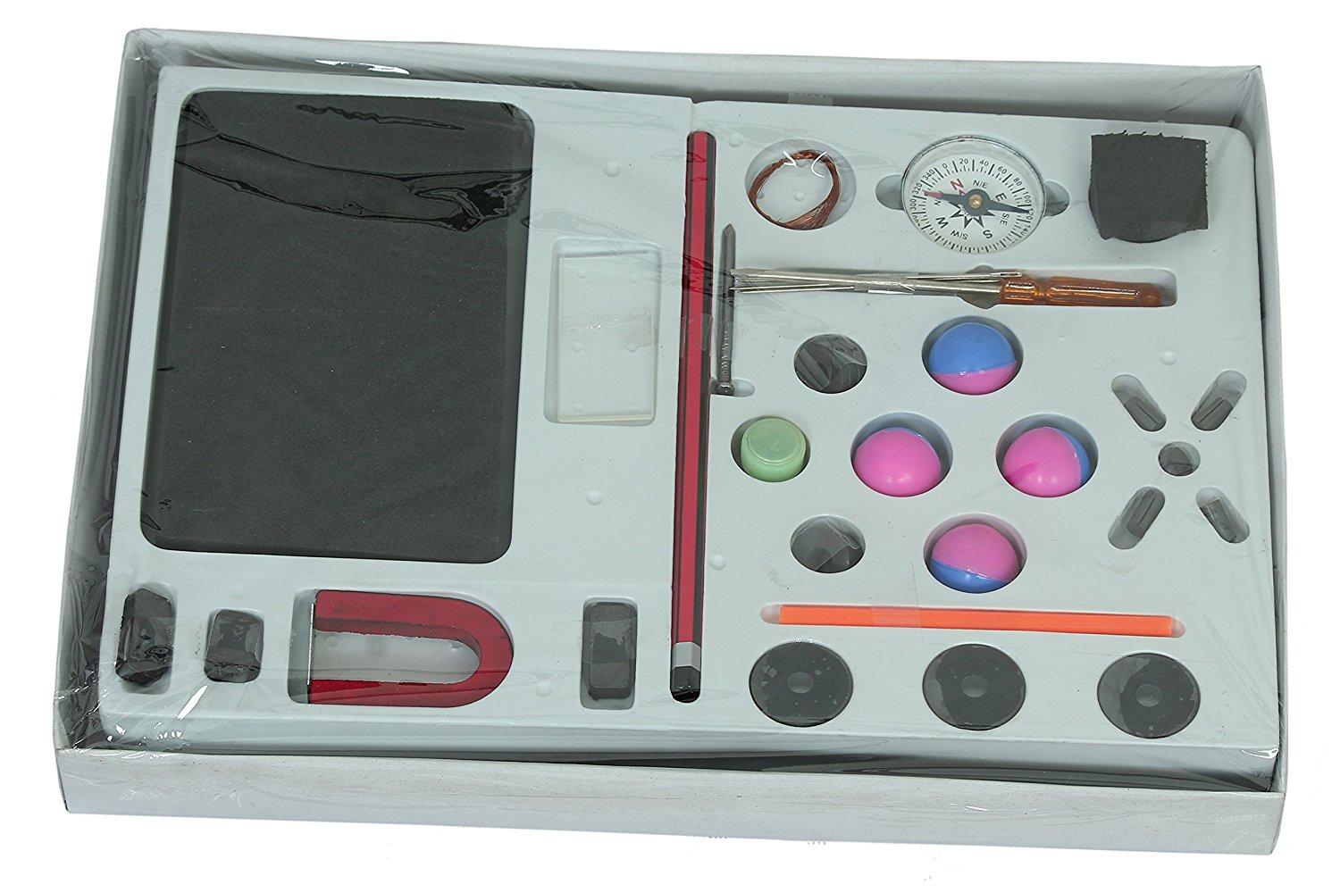 An experimentation kit to perform over 25 educative experiments and projects of magnetism. Useful for students of class 4 on wards. Kit has illustrative user manual and around 18 magnets of various size/shape, a compass, iron nail, copper wire, iron fillings, screw driver, needles, foam pieces, pencil, straw, plastic balls etc. Kit has horse shoe magnet, bar magnets, ring magnets, cylindrical magnets, small ring magnets, a disk magnet. Hands-On Learning generates conceptual clarity and interest in academics.