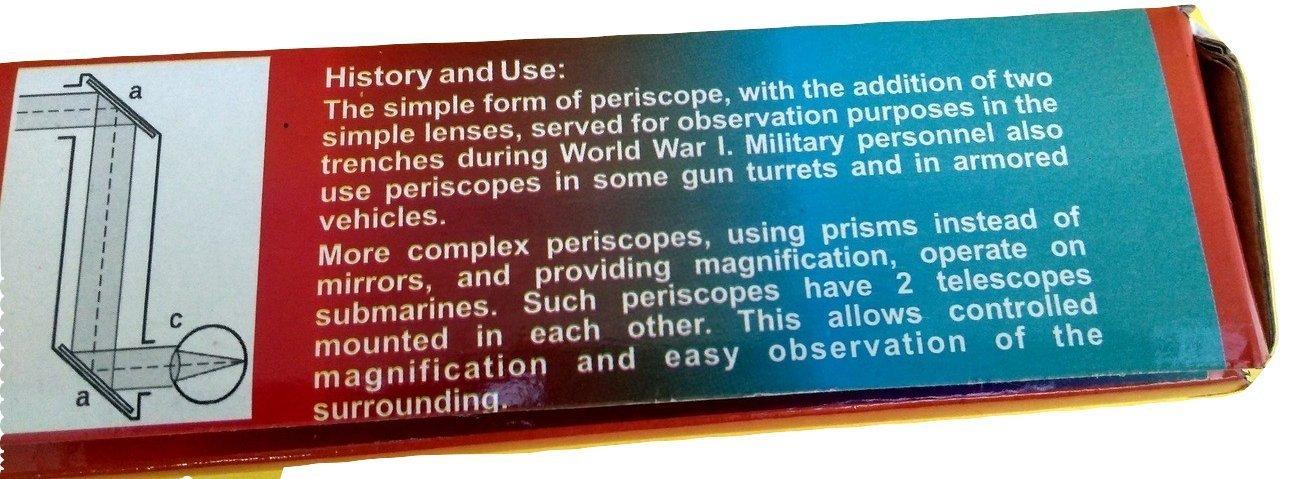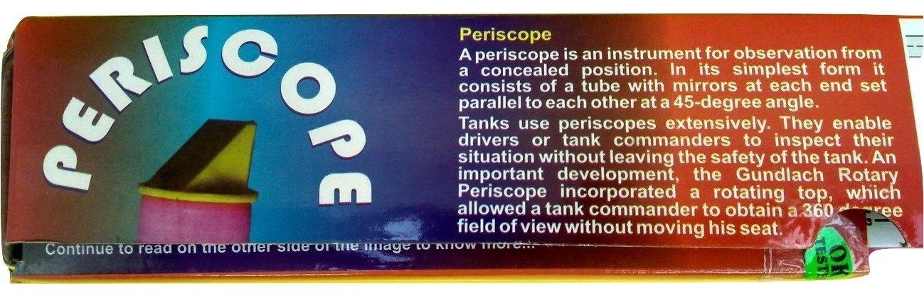 Periscope Is An Instrument For Observation From A Concealed Postion. In Simplest Form It Consists Of A Tube With Mirrors At Each End Set Parallel To Each Other At 45-Degree Angle. Tanks, Sub Marines Use Periscope Extensively. They Enable Drivers Or Tank Commanders To Inspect Their Situation Without Leaving The Safety Of Tank Or Marine. This Kit Helps Student To Make Real Periscope And Scan The Horizon Without Being Seen. Its A Unique And Fascinating Spying Toy Which Also Teaches Scientific Principles.