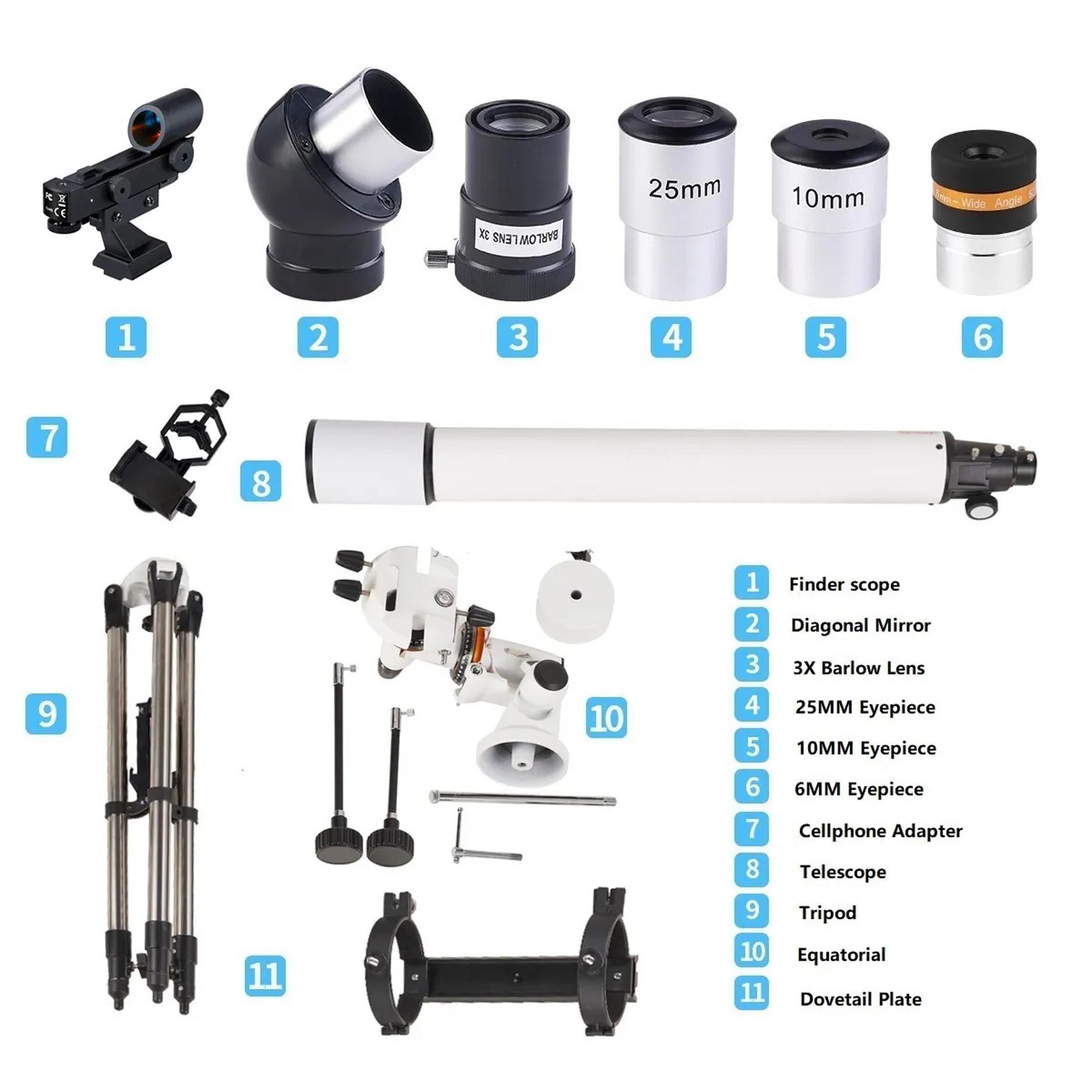 Skypoint 120F900 telescope feature two-element air-spaced fully multi-coated lenses that provide excellent terrestrial viewing as well as breathtaking views of the Moon planets and deep-sky objects