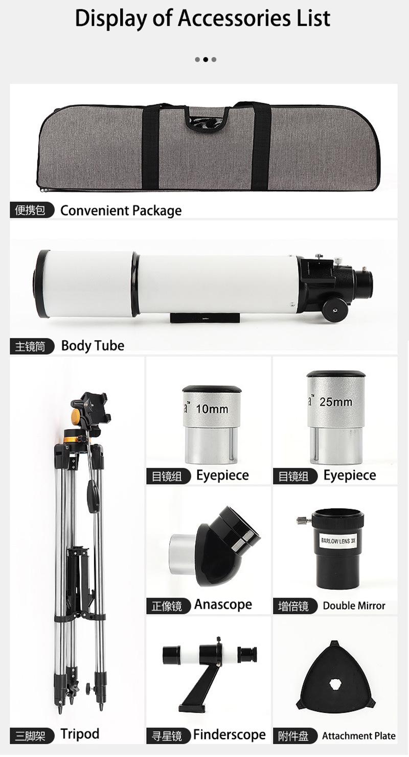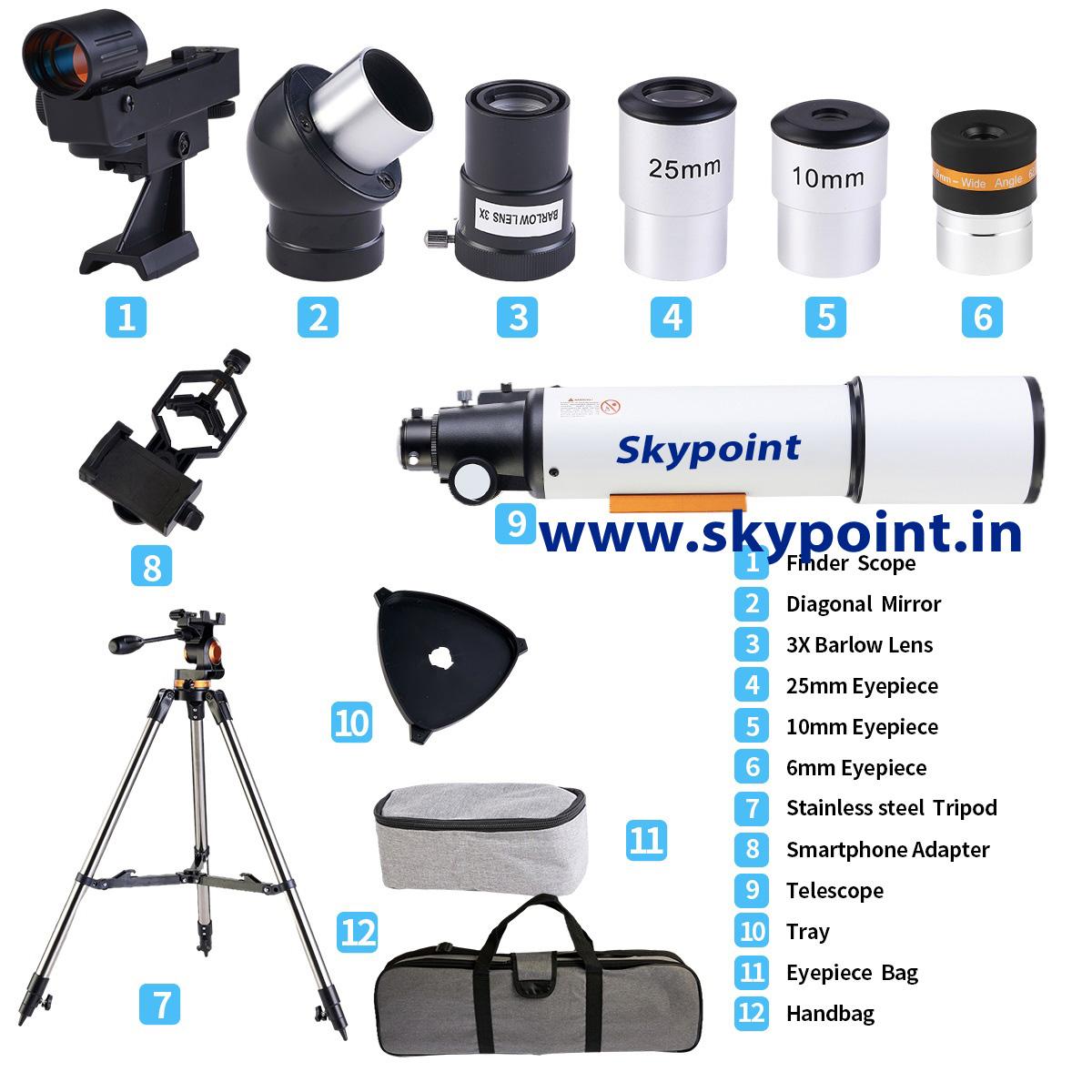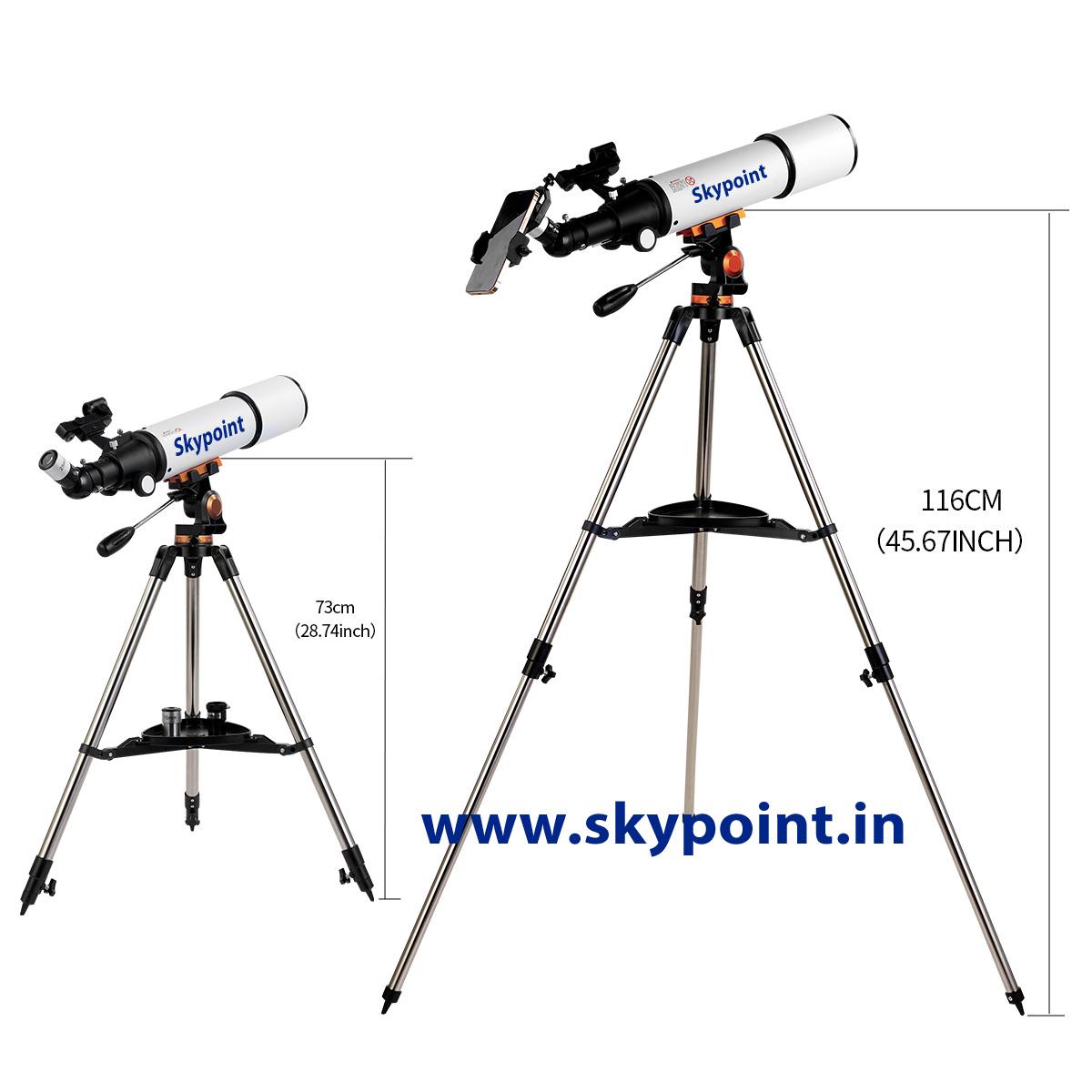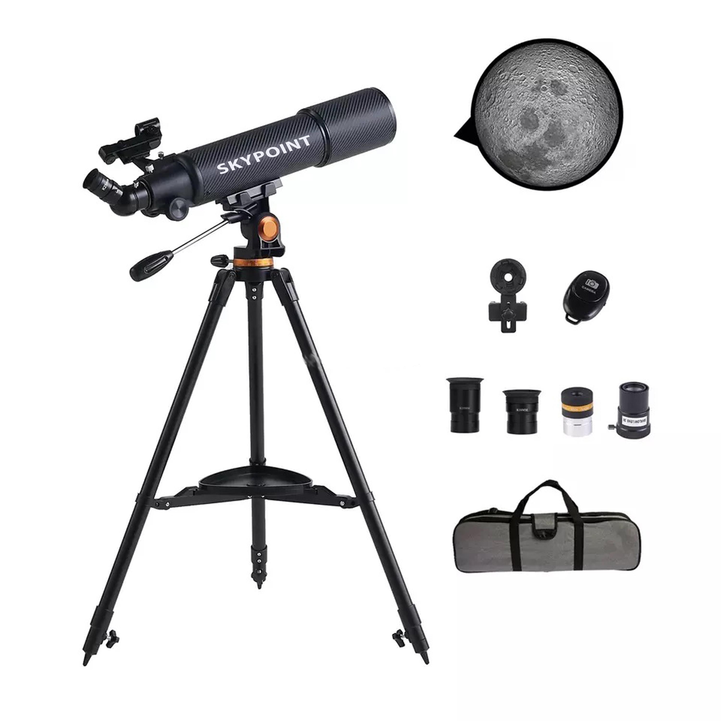 Skypoint 80AZ refractor telescope can be a good observation of moon and terrestrial objects. quick set up and easy find your objects, Ideal for beginners to explore vast sky like moons, planets, clusters and fog, And enjoy Distant scenery,like mountains, flowers, birds and wild animals. 500mm focal length and 80mm aperture, fully coated optical glass with high transmission coatings creates crisp images with increased brightness and clarity.