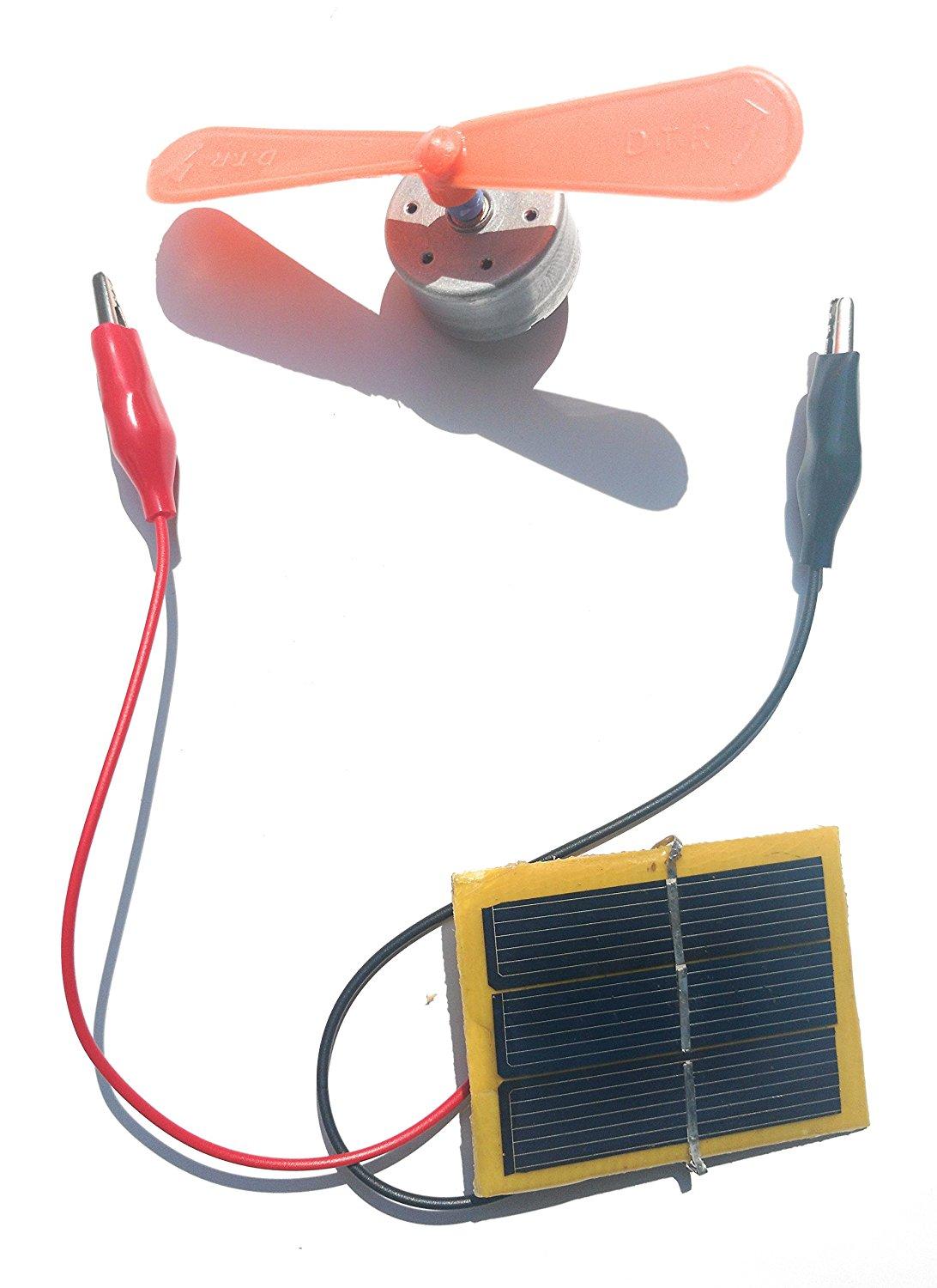 Includes Solar Panel of 1.5 V 150 mA with soldered wires for easy use in your own projects Includes good quality small DC motor with plastic bush and two blade fan to fit on the shaft. Use it as a wind mill demo or as a dynamo to produce electricity. Demonstrate use of solar energy to rotate motor and its fan Useful in many hobbyist projects,ideal for science fair projects. Kit has material that can be used for various school projects. Ideal for educational applications or for experimental use