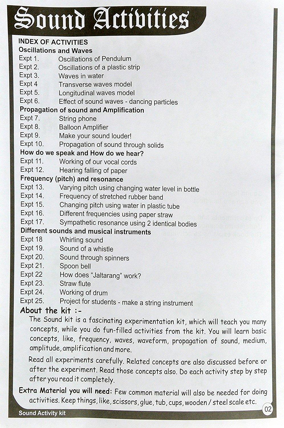 Kit contain material and instruction to perform more than twenty fascinating experiments Students can learn concepts such as frequency, wave, waveforms, amplitude and amplification. Explore propogation of sound through solids. Ideal for class fifth to class nine. Students will learn How do we speak and how do we hear, Oscillation and Waves, Frquency and Resonance, Sound and Musical instruments.
